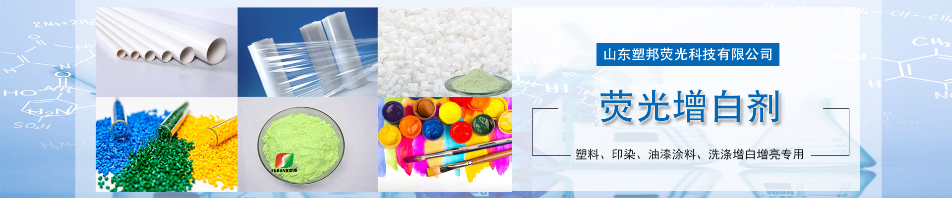 可根據白度要求選擇加入量,以下為參考用量: 1、聚氯乙烯(PVC): 增白:0.01~0.05%(10-50g/100kg物料) 透明:0.0001~0.001%(0.1-1g/100kg物料) 2、聚苯(PS): 增白:0.001%(1g/100kg物料) 透明:0.0001~0.001%(0.1-1g/100kg物料) 3、ABS: 0.01~0.05%(10-50g/100kg物料) 其他塑料:對于其他熱塑性塑料、醋酸纖維、聚甲基丙烯甲酯(PMMA)、聚酯滌綸切片也有很好的增白效果。